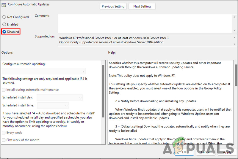 6. Select Disabled and hit Apply to save the changes. Once the system is restored to its previous state, the speed issue should be resolved. You can now choose to ignore the update installation prompts until a new update is released. After disabling, click Apply