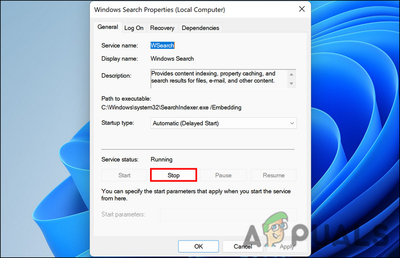 5. In the Properties dialog, click on the Stop button to disable the service. Stop the Windows Search Indexer service