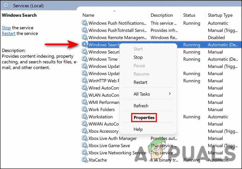 3. In the Services window, look for the Windows Search Indexer service and right-click on it.