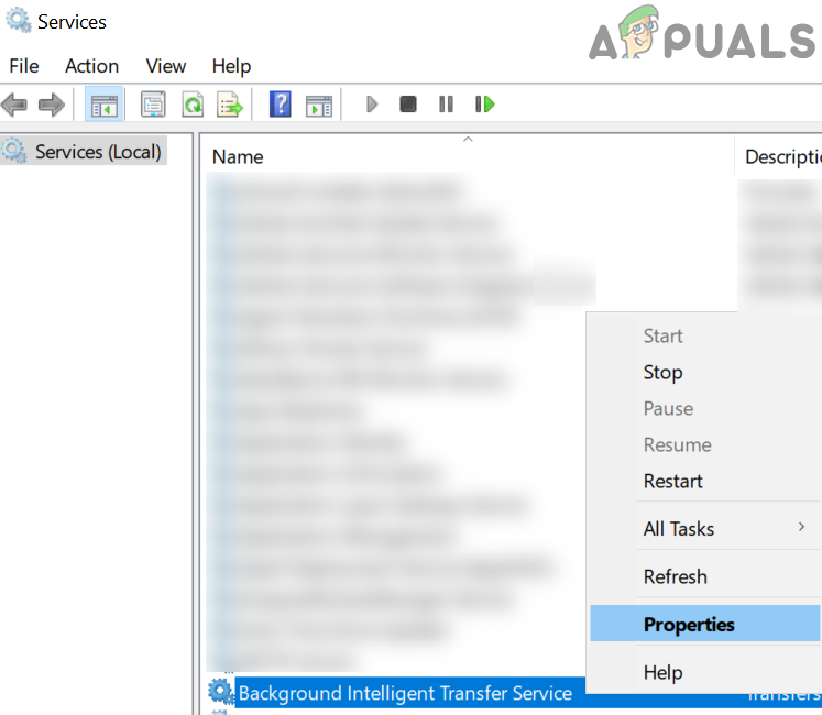 2. Now right-click on Background Intelligence Transfer Service and then select Properties. Open Properties of Background Intelligence Transfer Service
