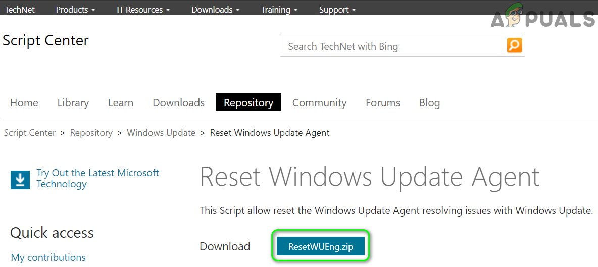 1. Launch a Web browser and download the Windows Update Agent Reset tool (ResetWUEng.zip). Download ResetWUEng.zip