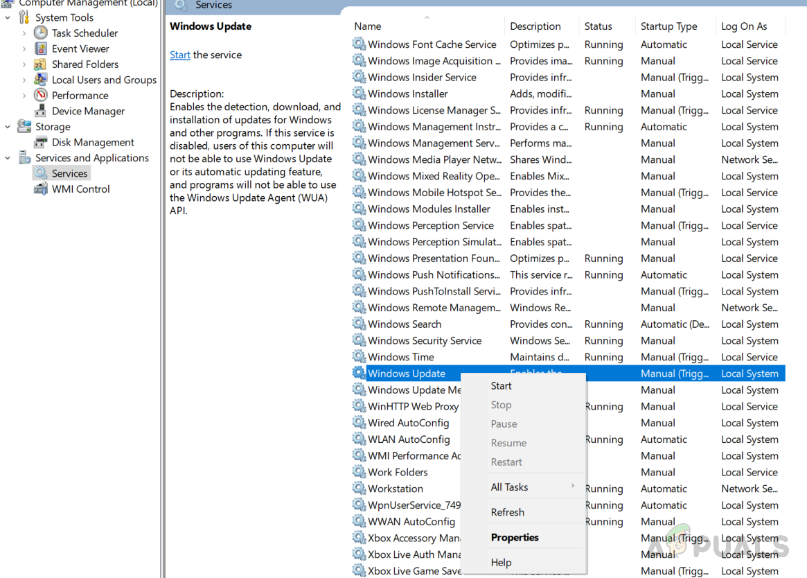 6. Then switch to the Services window and start the Windows Update Service. Windows Update Start and Stop