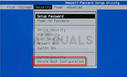 - Use the right arrow key to switch to the Security menu when the BIOS settings window opens, use the down arrow key to select the Secure Boot Configuration from the menu, and press Enter. These options are sometimes location under System Configuration or the Security tab