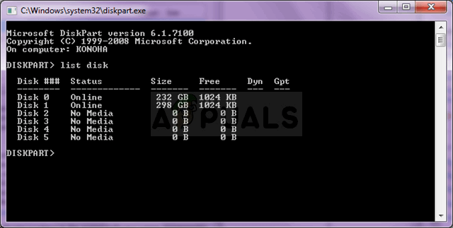 - This will change the Command Prompt window to enable you to run various Diskpart commands. The first one you will run is the one which will enable you to see the complete list of all available disks.
