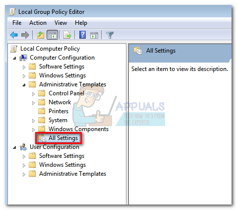 - Browse to Local Computer Policy > Computer Configuration > Administrative Templates and click on All Settings to select it.