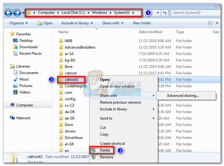 - Navigate to C:\Windows\System32 and locate the Catroot2 folder. Right-click on it and select Delete. You will need administrator privileges to complete this operation.