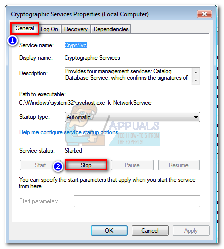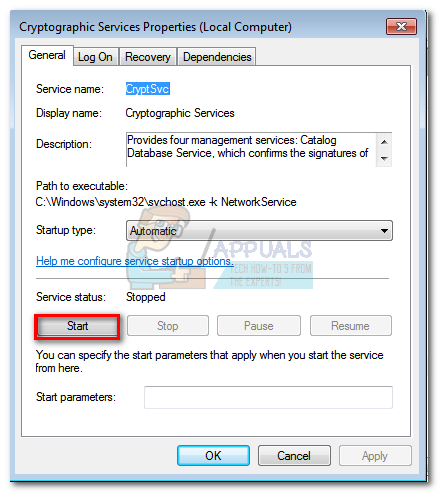 Note: Keep in mind that your user account needs to be set up as an admin to delete Catroot2. If you are unable to delete the Catroot2 folder, try renaming it instead. You can use any given name. If that also fails, try rebooting in safe mode and attempt to delete the Catroot2 folder again. - Return to the Cryptographic Services Properties window in the General tab and click the Start button to restart Cryptographic Services.