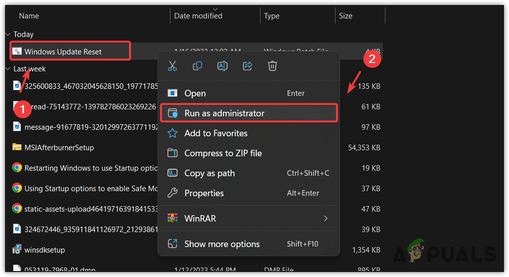 2. Once done, right-click on it and select Run as administrator. Running Windows update reset batch file