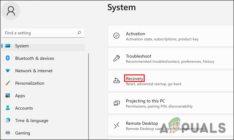 - Move to the right side of the window and click on Recovery.