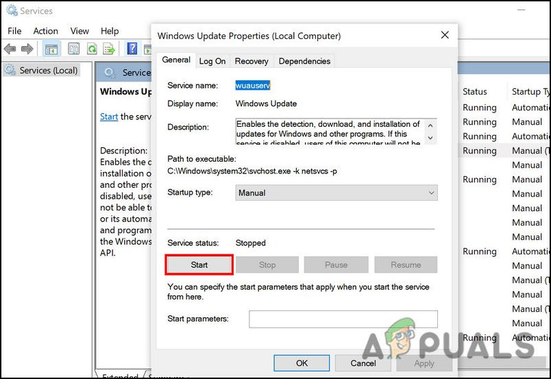 - If the service is already running, click on the Stop button, wait for a few seconds, and then hit Start again.