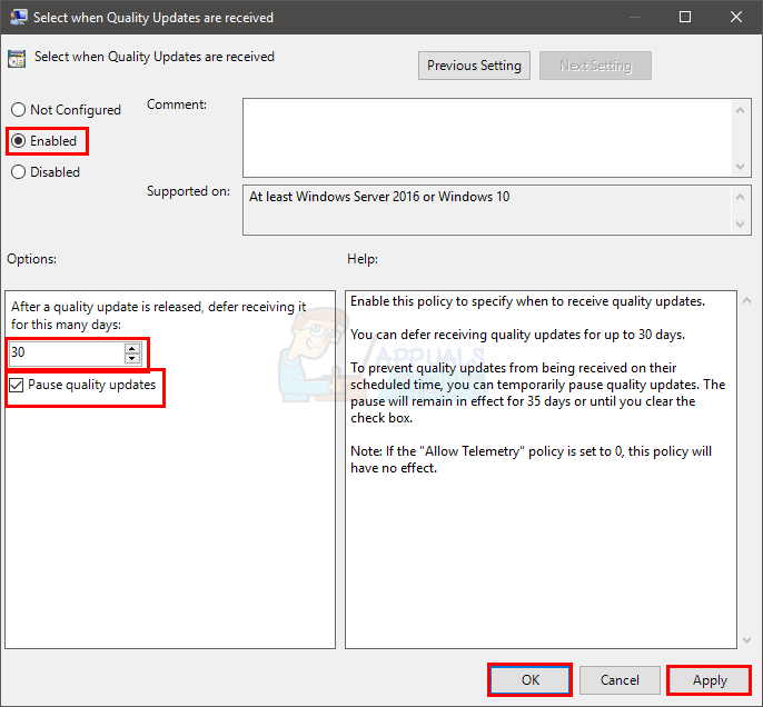 - You can also check the option Pause quality updates to pause the quality updates for a maximum of 35 days (or until you come back and uncheck this option).