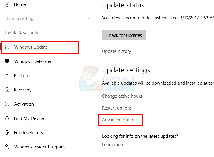 - Select Advanced Options. Make sure you the Windows Update section is selected (from the left pane). If it isn’t, then select Windows Update from the left pane.