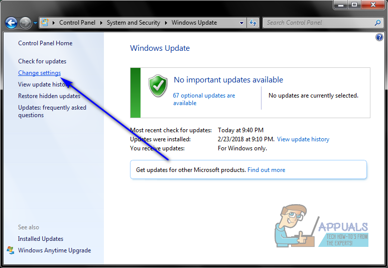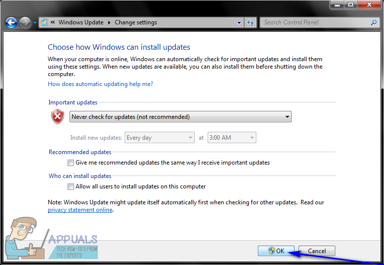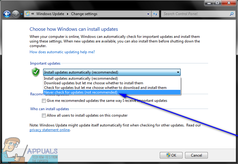 On Windows 7, 8 and 8.1, automatic updates can be disabled from within Windows Update itself. To disable updates on Windows 7, 8 and 8.1, you need to: