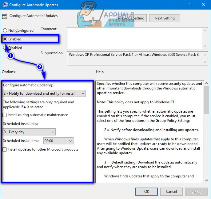 7. Open the dropdown menu located directly under the Configure automatic updating: option and click on 2 – Notify for download and notify for install to select it.