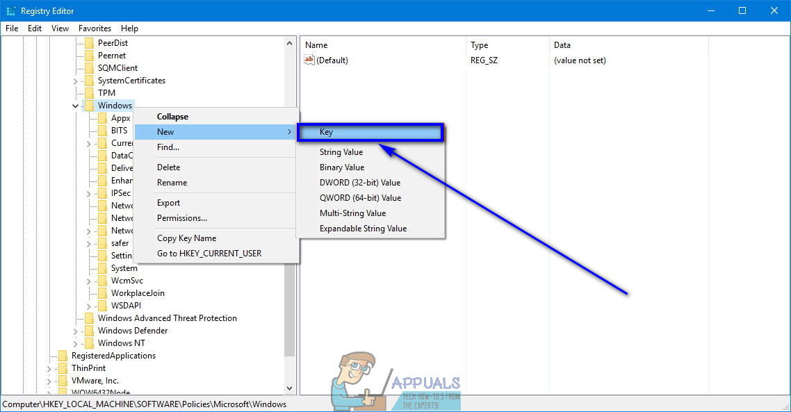 4. In the left pane of the Registry Editor, right-click on the Windows sub-key under the Microsoft key, hover over New and click on Key.