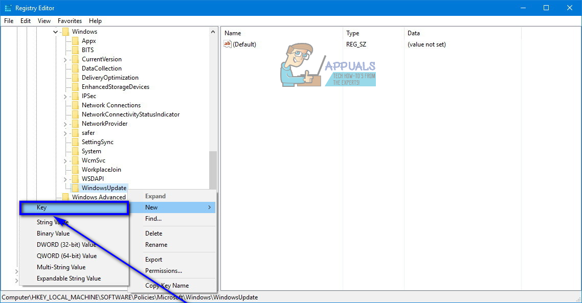 6. Right-click on the newly created WindowsUpdate key, hover over New and click on Key.