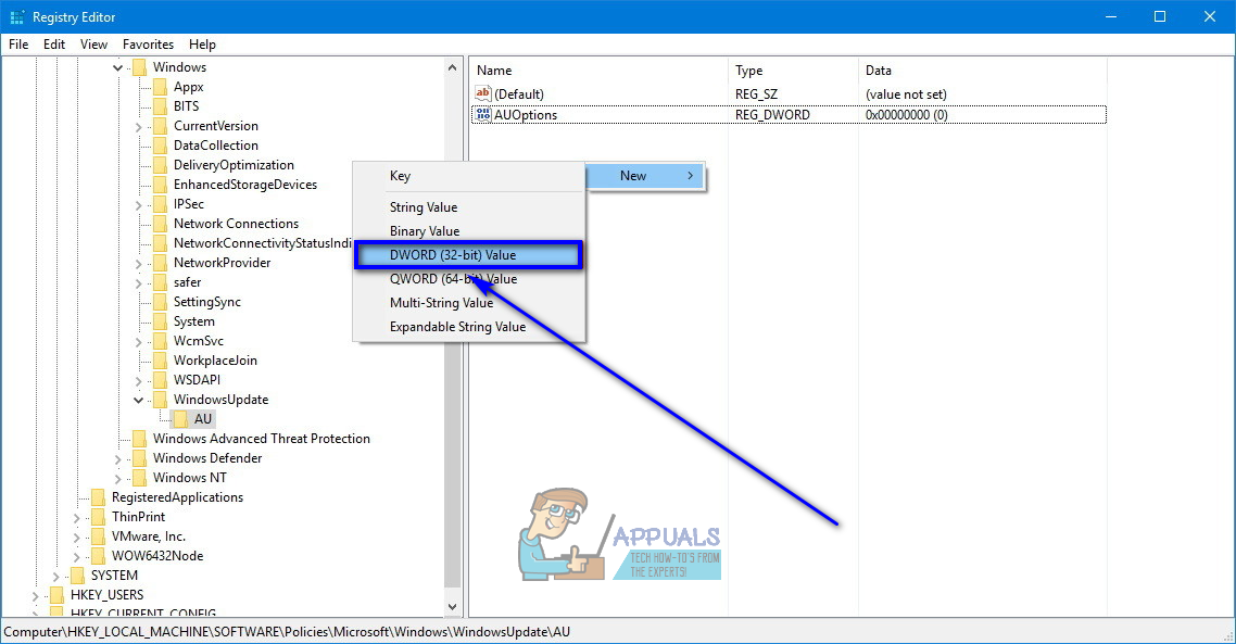 11. Double-click on the newly created AUOptions registry value to modify it.
