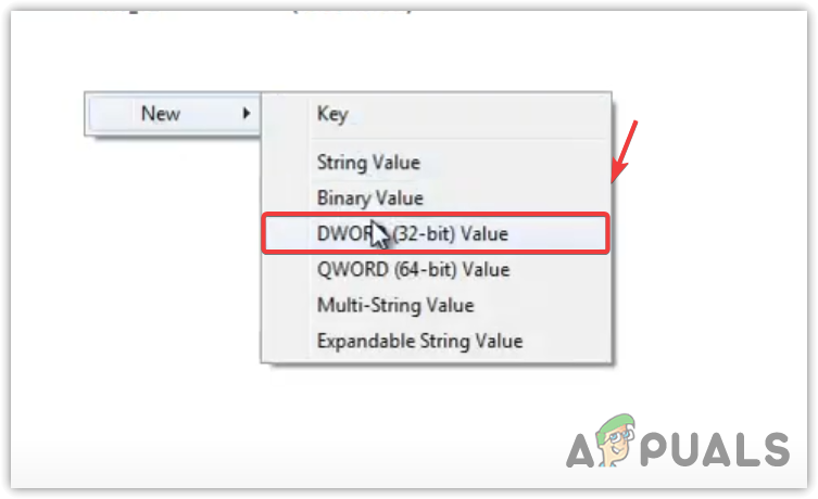 6. Hover New and select DWORD (32-bit) Value. Creating a registry entry