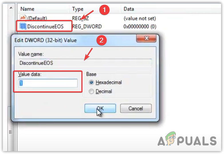 4. On the right pane, look for the DiscontinueEOS entry, double-click on it, and change its value data to 1.