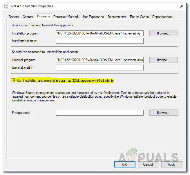 As it turns out, if you are coming across the said error code while trying to deploy a .NET framework across the computers, you can fix it by ticking a certain checkbox in the installer properties. Apparently, the error code appears when you have the program running as a 32-bit process on a 64-bit architecture computer. This can be easily resolved by following the instructions down below: