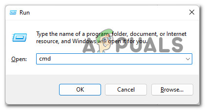 - Press Windows key + R to open up a Run dialog box. Next, type ‘cmd’ inside the text box, then press Ctrl + Shift + Enter to open up an elevated Command Prompt.