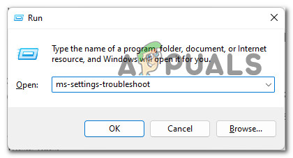 - Press Windows key + R to open up a Run dialog box. Next, type ‘ms-settings-troubleshoot’ inside the text box and press Enter to open up the Troubleshooting tab from the Settings app.