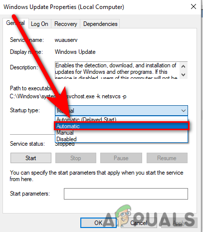 Select the Properties option in Windows Update Service - Change the Startup type from Manual to Automatic by clicking on the dropdown of Startup type, and then select the Automatic option.