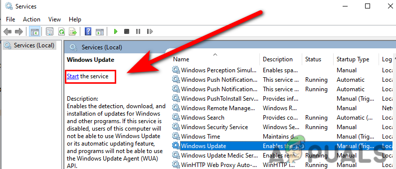 Start the Windows update service - If your service is already enabled then click on Restart to restart the service.