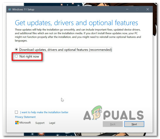Modify the default Setup downloading behavior - Once you’re inside the Get updates, drivers, and optional features, choose the Not right now toggle, then click on Next and proceed to install Windows 11 normally.