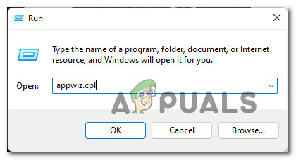 - Press Windows key + R to open up a Run dialog box. Next, type ‘appwiz.cpl’ inside the text box, then press Enter to open up the Programs and Features screen.
