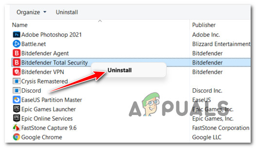 Uninstall the 3rd party antivirus - Inside the uninstallation screen, follow the on-screen instructions to complete the uninstallation of the conflicting antivirus suite.