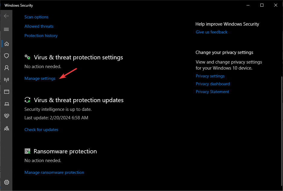 - Choose the Windows Security app from the search results, head to Virus & Threat Protection, and under this section, click on Manage settings.