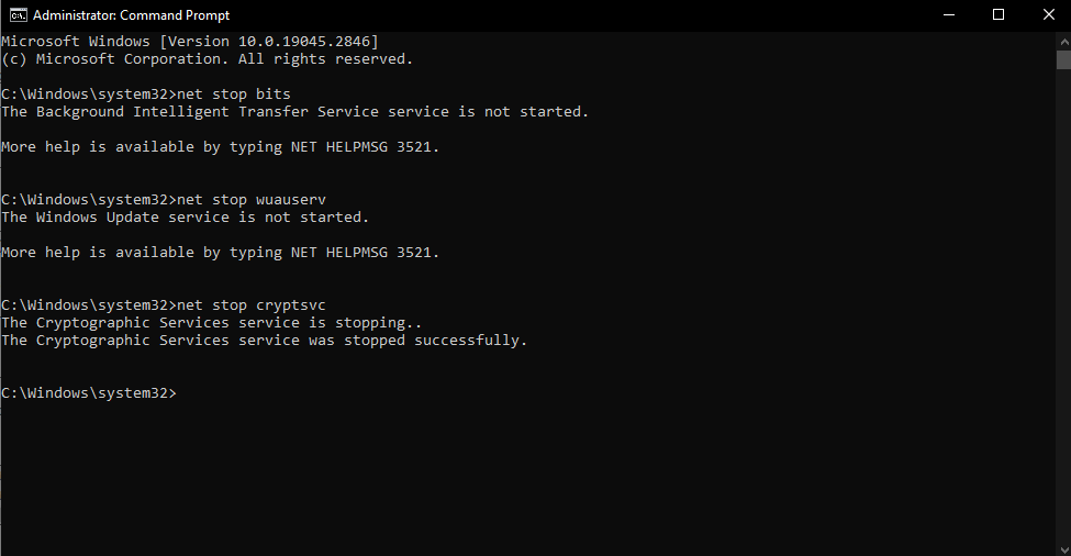 - Use the following commands to stop BITS and other related services, pressing Enter after each: