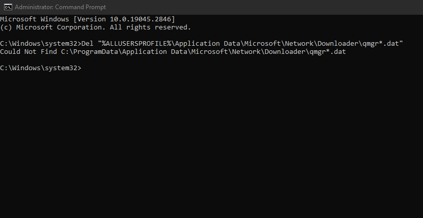 Del "%ALLUSERSPROFILE%\Application Data\Microsoft\Network\Downloader\qmgr*.dat"