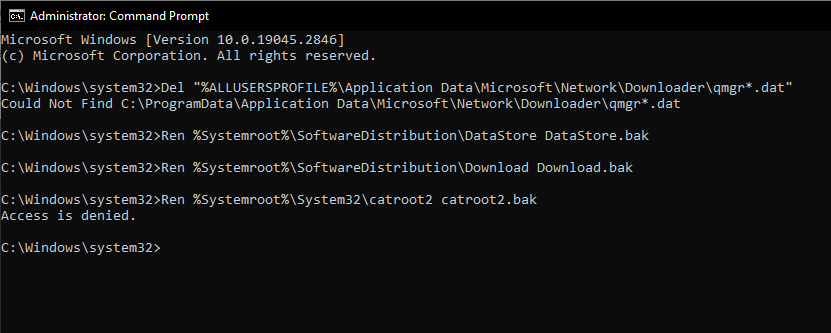 Ren %Systemroot%\SoftwareDistribution\DataStore DataStore.bak Ren %Systemroot%\SoftwareDistribution\Download Download.bak Ren %Systemroot%\System32\catroot2 catroot2.bak
