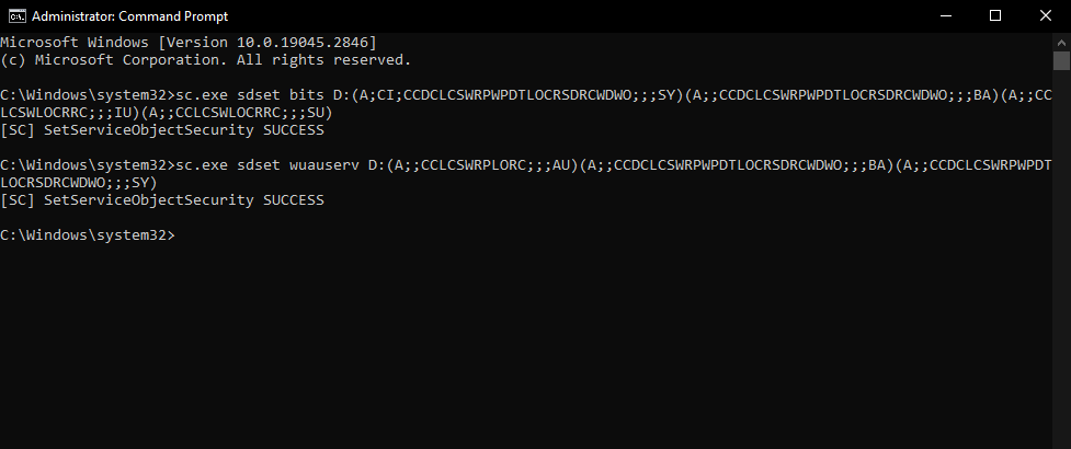 sc.exe sdset bits D:(A;CI;CCDCLCSWRPWPDTLOCRSDRCWDWO;;;SY)(A;;CCDCLCSWRPWPDTLOCRSDRCWDWO;;;BA)(A;;CCLCSWLOCRRC;;;IU)(A;;CCLCSWLOCRRC;;;SU) sc.exe sdset wuauserv D:(A;;CCLCSWRPLORC;;;AU)(A;;CCDCLCSWRPWPDTLOCRSDRCWDWO;;;BA)(A;;CCDCLCSWRPWPDTLOCRSDRCWDWO;;;SY)
