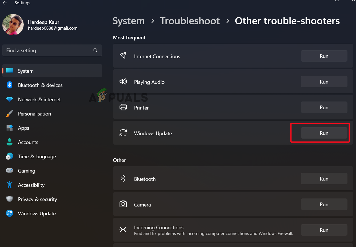 Click on Troubleshoot - Then click on the Other-Troubleshooters option and click on the Windows Update option and click on Run.