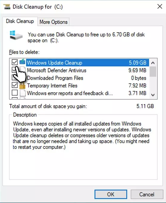 - In the Disk Cleanup window, select items such as Temporary Internet Files, Windows Update, Temporary Files, Recycle Bin, and Delivery Optimization. Click OK to proceed.