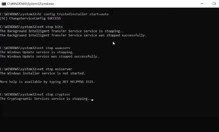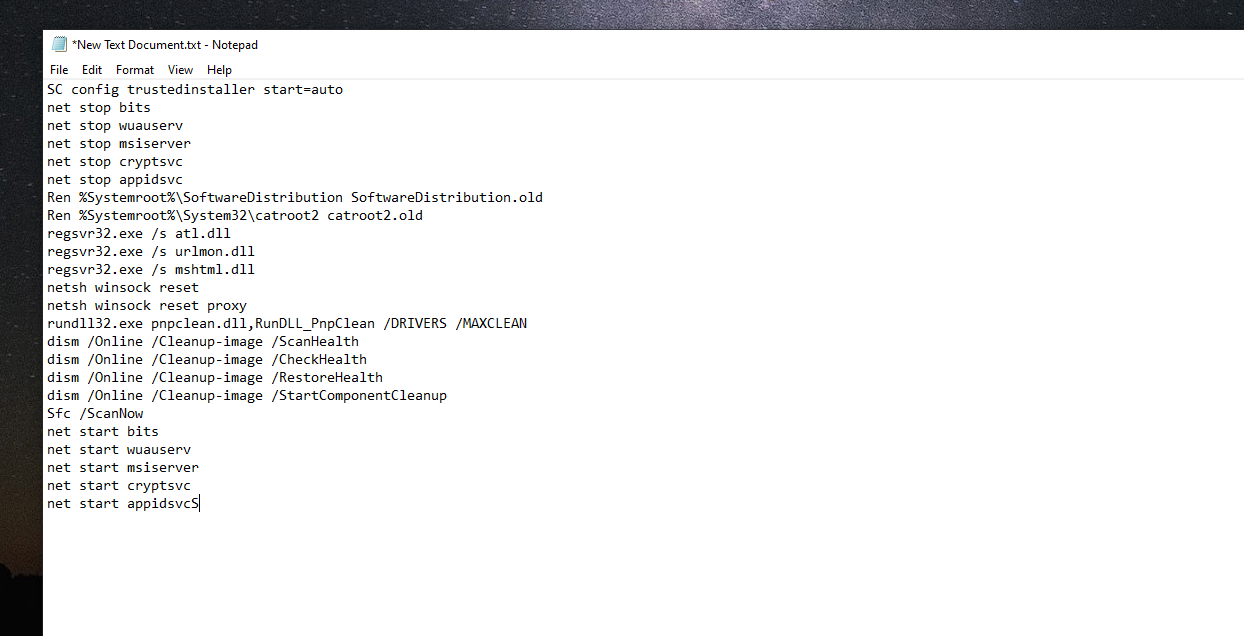 SC config trustedinstaller start=auto net stop bits net stop wuauserv net stop msiserver net stop cryptsvc net stop appidsvc Ren %Systemroot%\SoftwareDistribution SoftwareDistribution.old Ren %Systemroot%\System32\catroot2 catroot2.old regsvr32.exe /s atl.dll regsvr32.exe /s urlmon.dll regsvr32.exe /s mshtml.dll netsh winsock reset netsh winsock reset proxy rundll32.exe pnpclean.dll,RunDLL_PnpClean /DRIVERS /MAXCLEAN dism /Online /Cleanup-image /ScanHealth dism /Online /Cleanup-image /CheckHealth dism /Online /Cleanup-image /RestoreHealth dism /Online /Cleanup-image /StartComponentCleanup Sfc /ScanNow net start bits net start wuauserv net start msiserver net start cryptsvc net start appidsvc