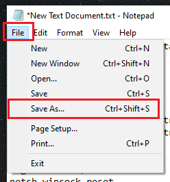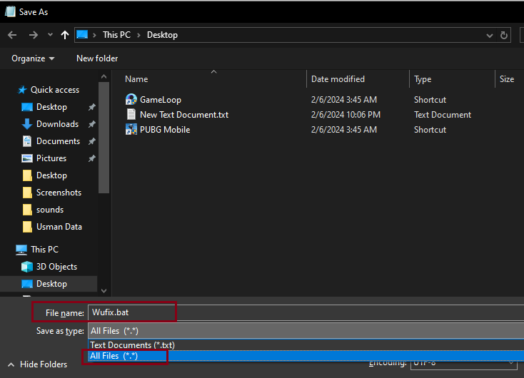 - Name the file ‘Wufix.bat‘, change the Save as type to All Files, and save it on the Desktop.