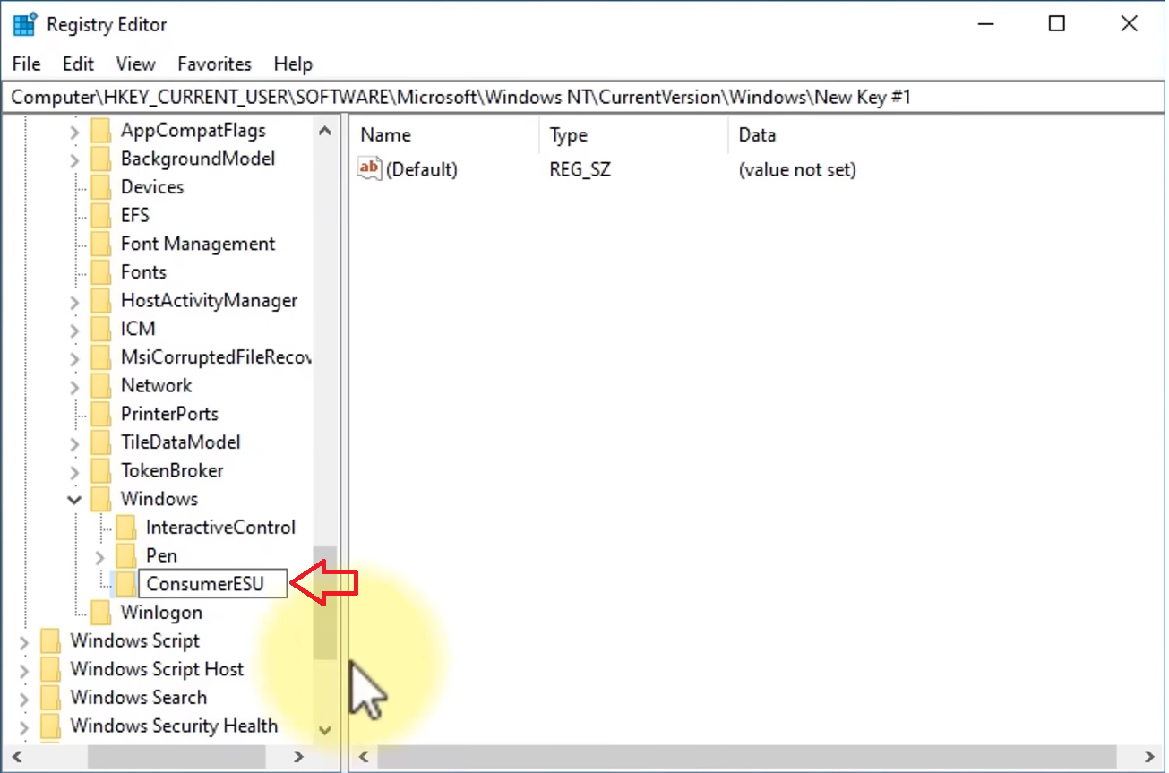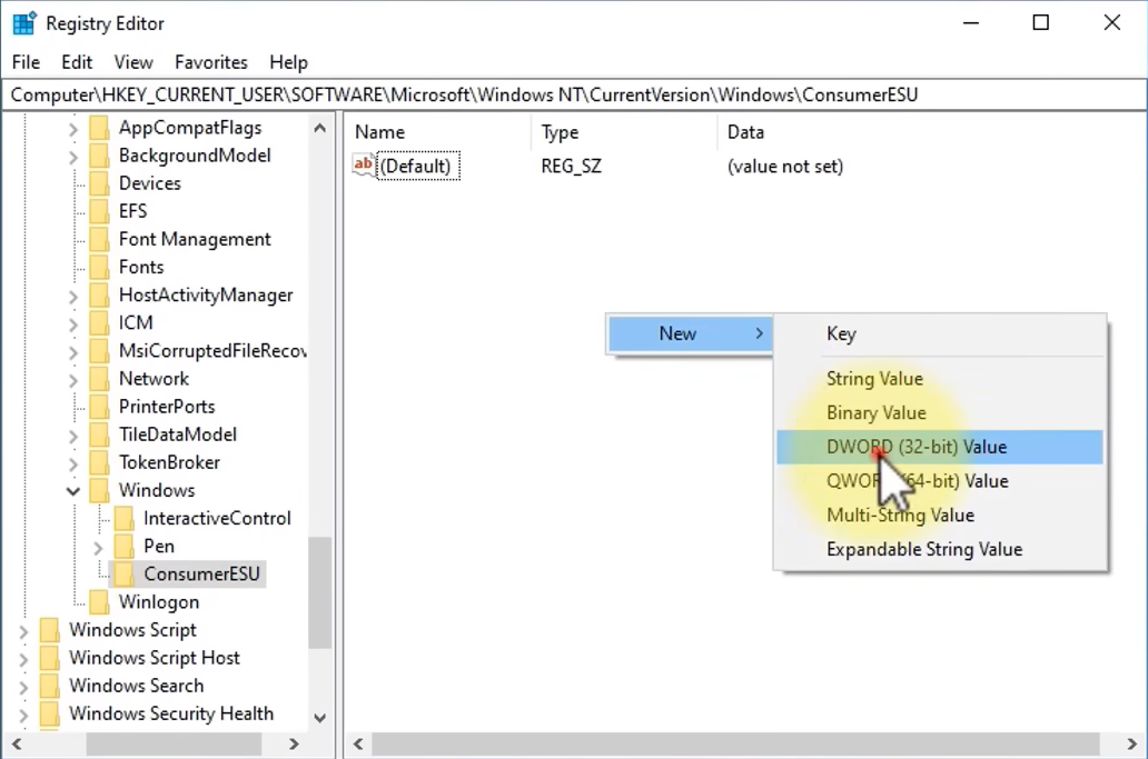 - Inside ConsumerESU, right-click on empty space → New → DWORD (32-bit) Value.