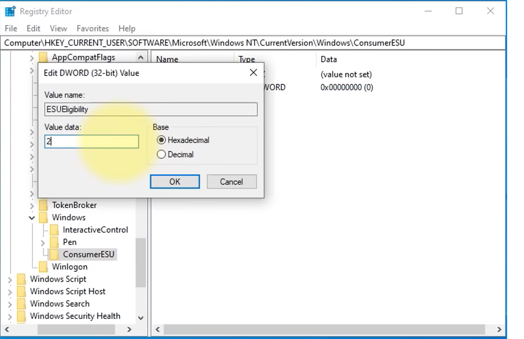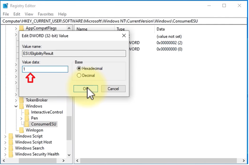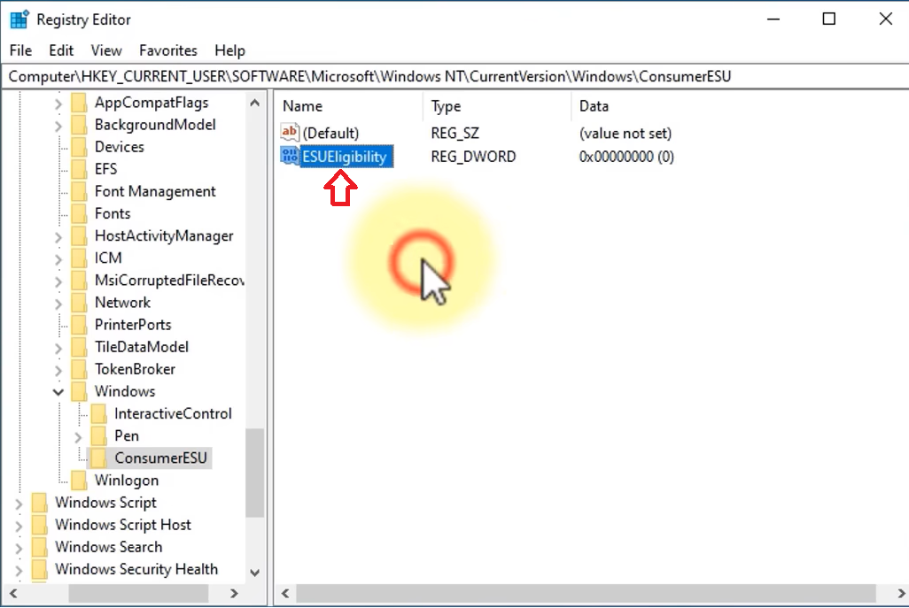 - Create another DWORD (32-bit) Value and name it ESUEligibilityResult.