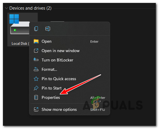 Note: Unless you modified the default lettering, your Windows drive will likely be Local Disk (C:). - Next, right-click on the C drive and choose Properties from the context menu that just appeared.