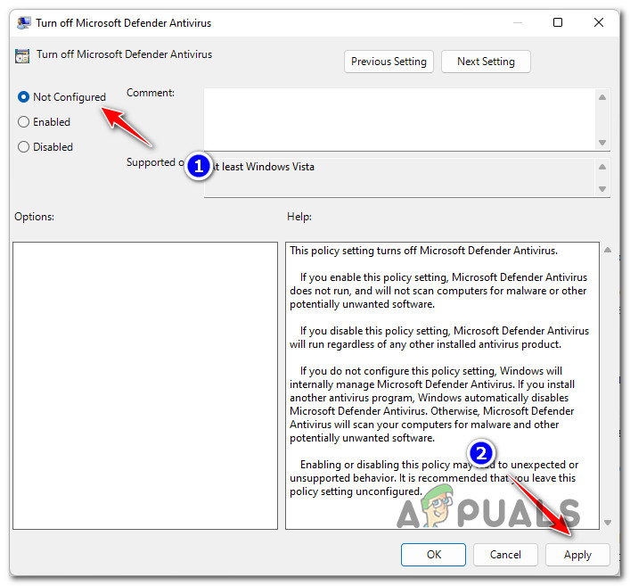 Disable the Microsoft Defender Antivirus - Next, once you’re inside the Turn Off Microsoft Defender Antivirus policy, set the policy to Disabled or Not Configured, then click on Apply to save the changes.