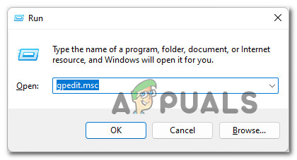 - Press Windows key + R to pen up a Run dialog box. Next, type ‘gpedit.msc’ inside the text box and press Ctrl + Shift + Enter to open up the Local Group Policy Editor with admin access.