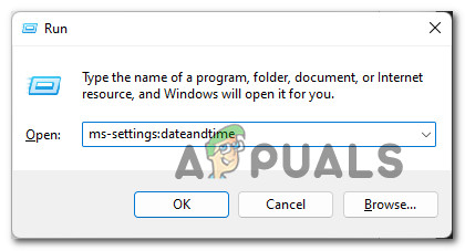 - Press Windows key + R to open up a Run dialog box. Inside the newly appeared Run box, type ‘ms-settings:dateandtime’ and press Enter to open up the Date & Time window.