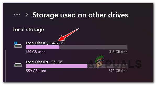 Checking for Free space - Next, once you are transported to the Storage used on other drives tab, click on your OS drive (Windows icon).