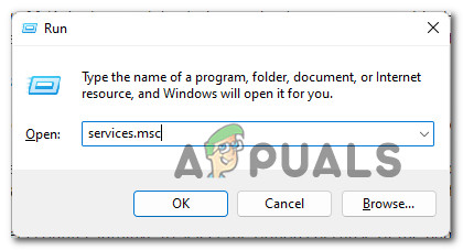 - Press Windows key + R to open up a Run dialog box. Next, type ‘services.msc’ inside the text box and press Enter to open up the Services screen.