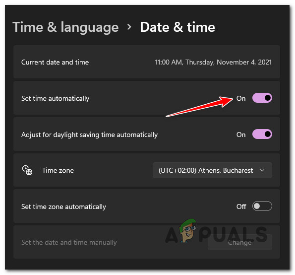 Open up the Date & Time window - Once you’re inside the Date & Time window, move over to the right-hand side menu and ensure that the checkbox associated with Set time automatically is enabled.