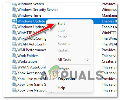 Checking for Updates inside Windows Security - Regardless of the outcome (if the update is successful or not), maximize the Services menu once again, right-click on Windows Update once again (from the right-hand pane) and choose Start from the context menu that just appeared.